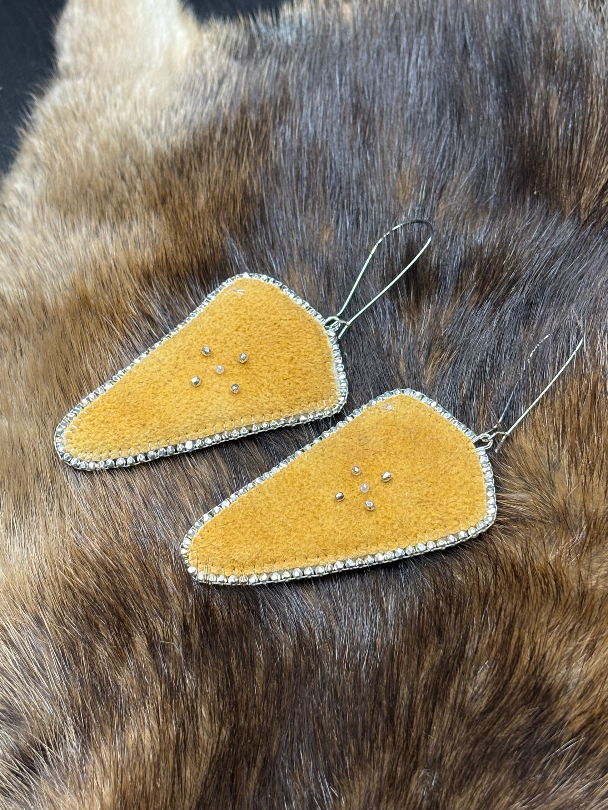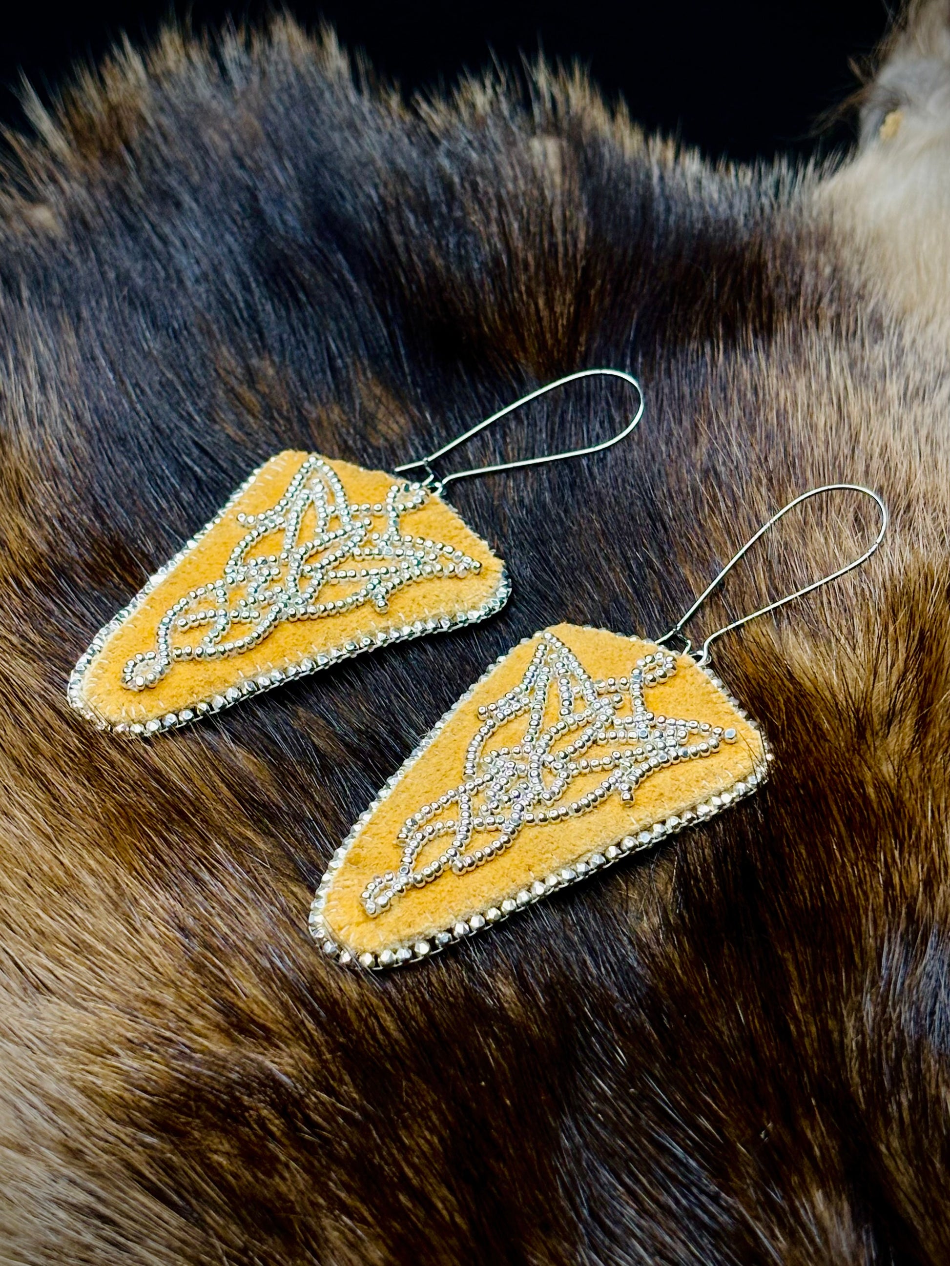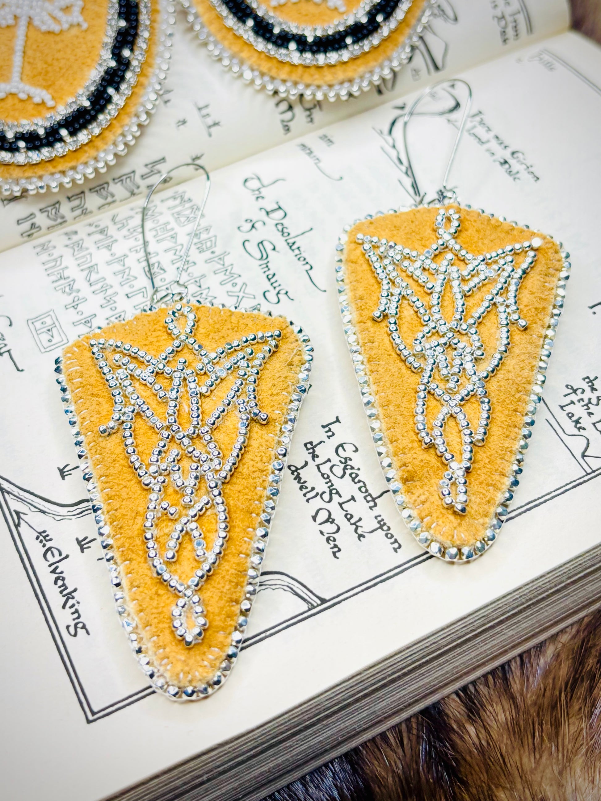 LOTR inspired earrings. Made on authentic tanned Moosehide, size 11 czech sterling silver charlottes, with hypoallergenic kidney hooks. Comes with 2 interchangeable kidney hooks that are sizes small and large.